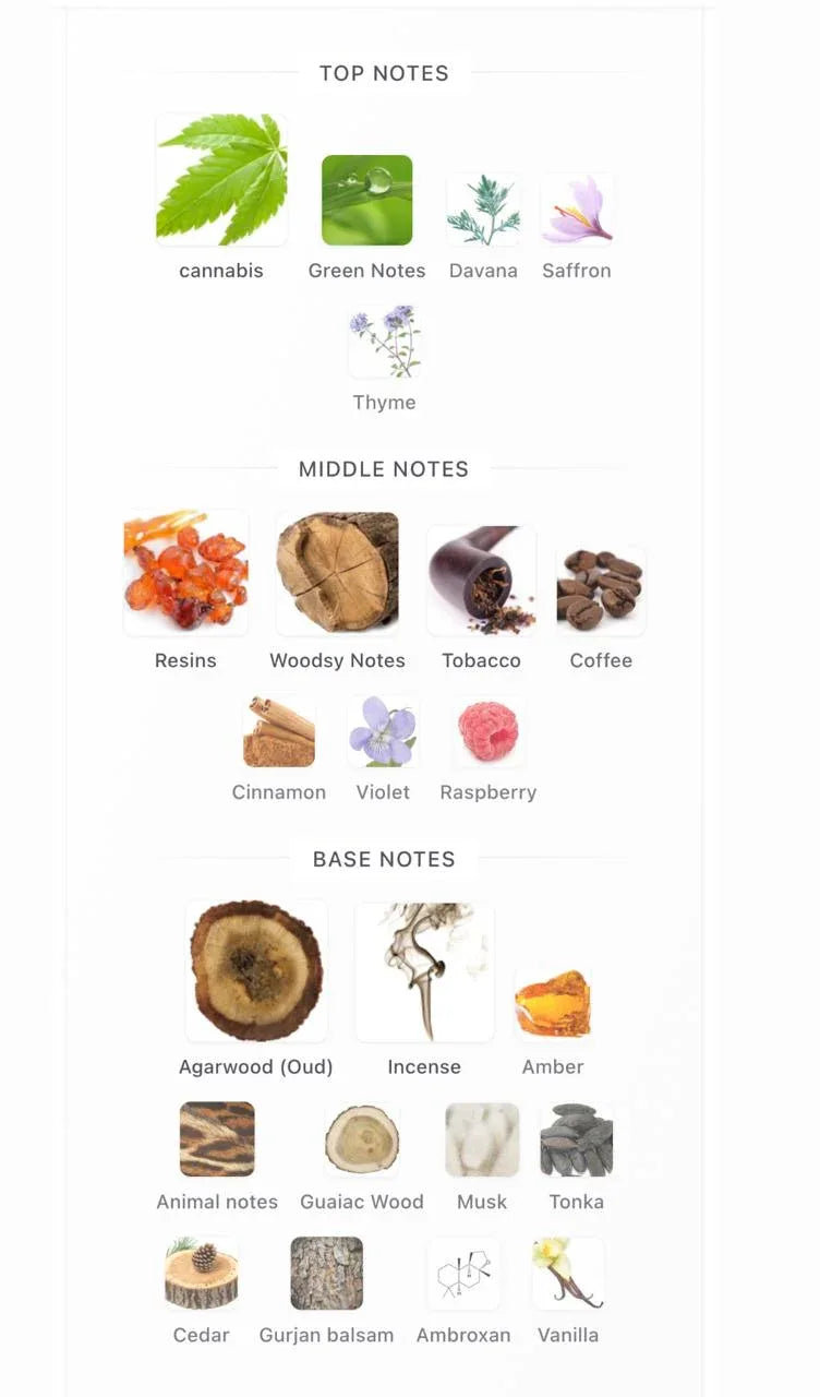 - Top Notes: Green Notes and Cannabis (Deep & Smoky Aroma)