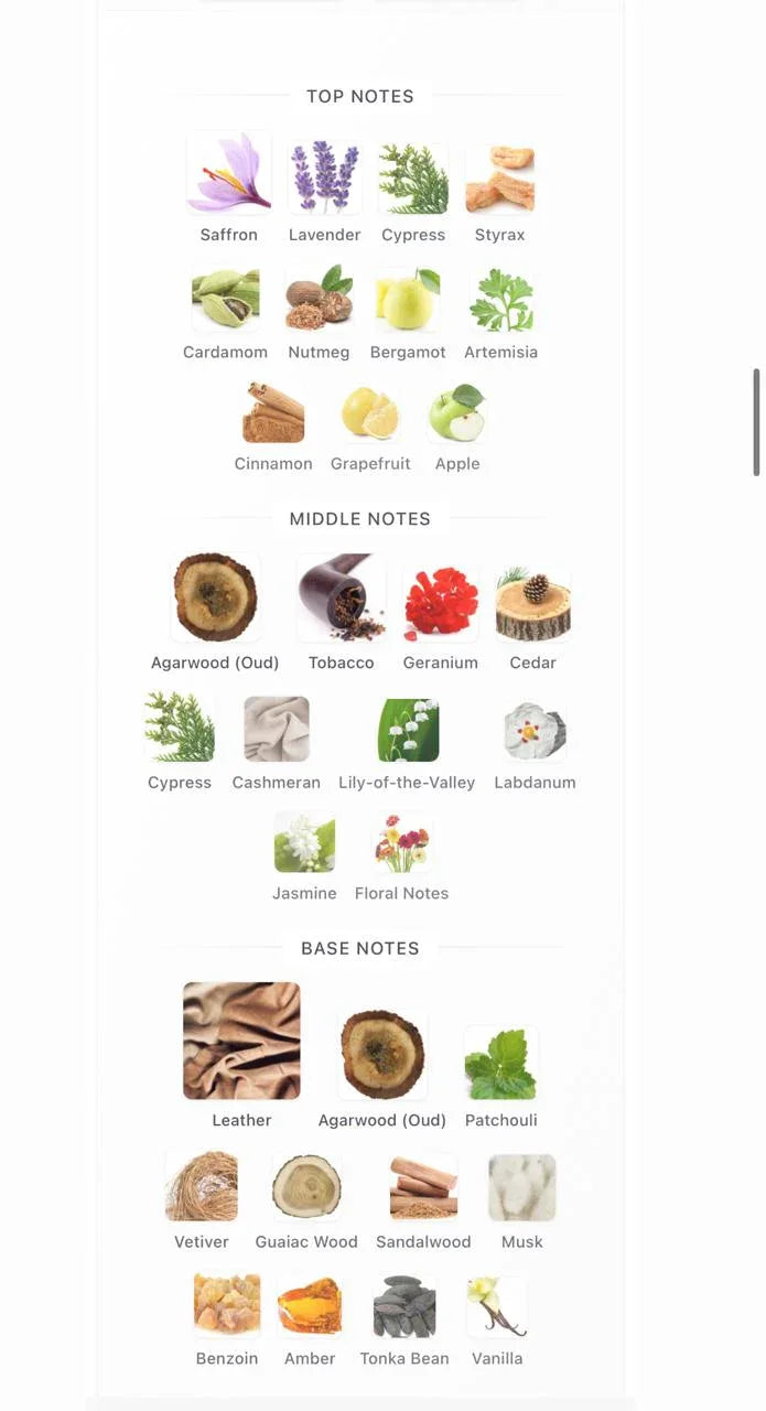 - Base Notes: Amber, Musk, Leather and Patchouli (Rich & Sophisticated)